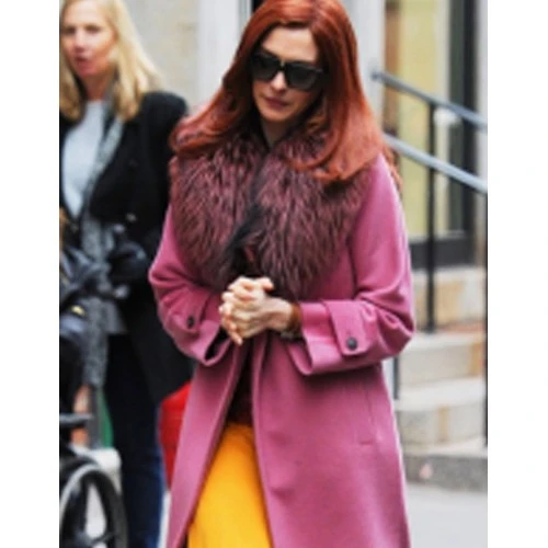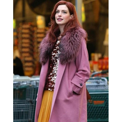Anne Hathaway Modern Love Faux Fur Collar Pink Trench Coat