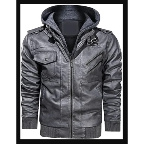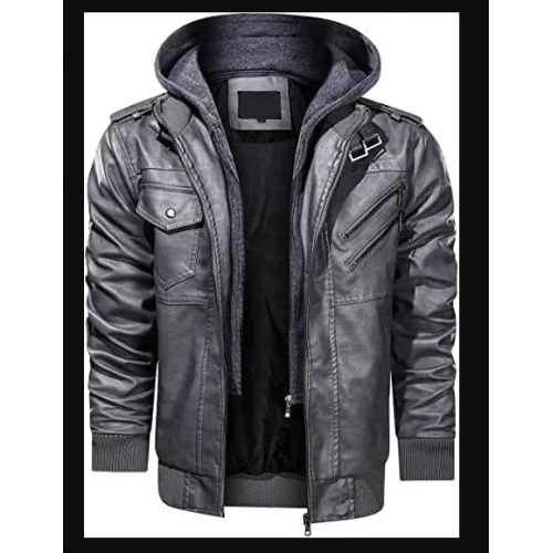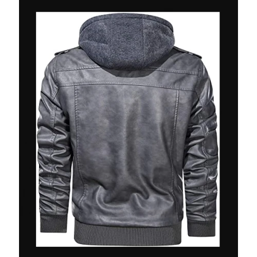 Mens Biker Motorcycle Bomber Removable Hood Grey Real Lambskin Leather Jacket